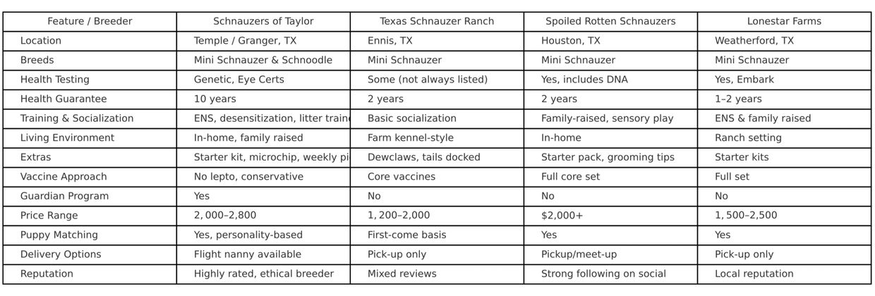 It looks like “Schnauzers of Taylor” refers to a well‑established preservation breeder in Temple / Granger, Texas, specializing in Miniature Schnauzers and Mini Schnoodles, run by Donna and her family. Here’s what I found:🏆